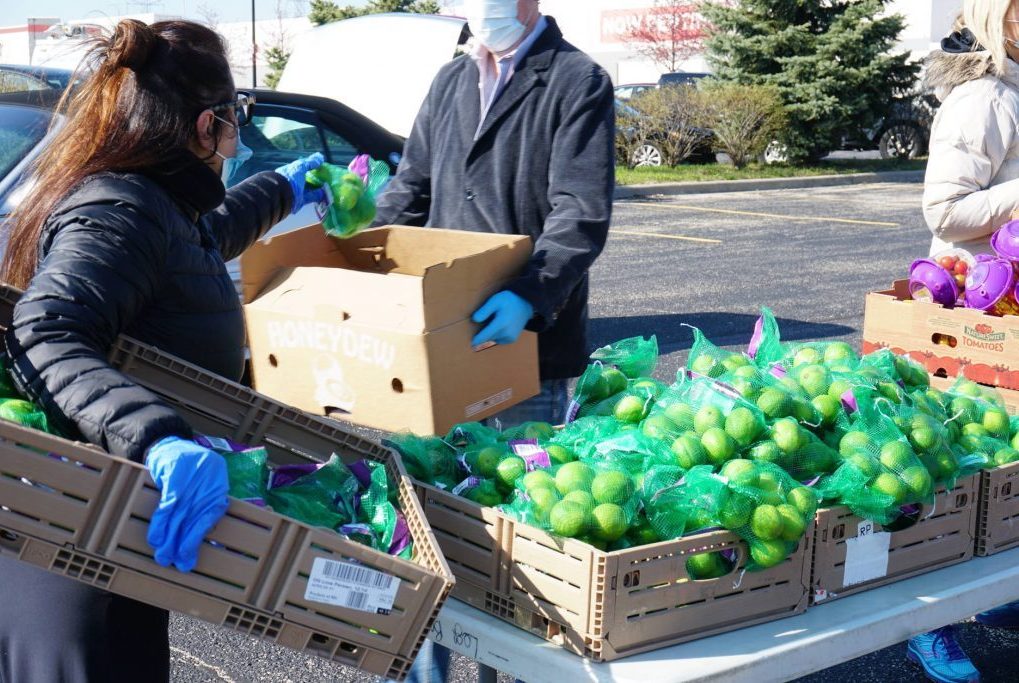 A volunteer with the Northern Illinois Food Bank hands out fresh produce for distribution amid the COVID-19 pandemic.