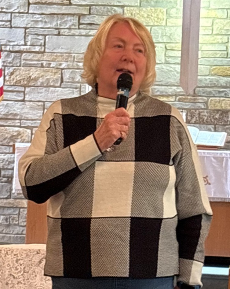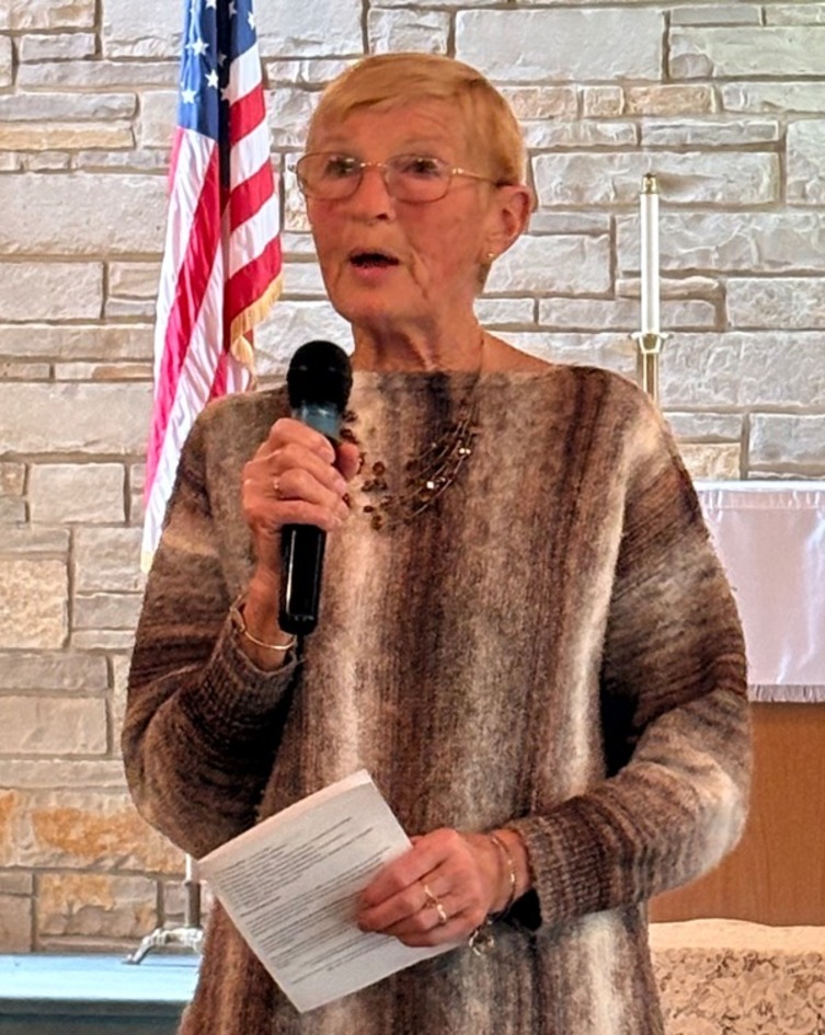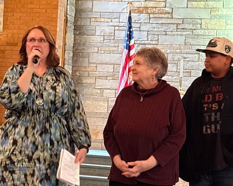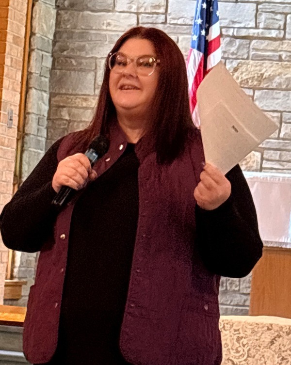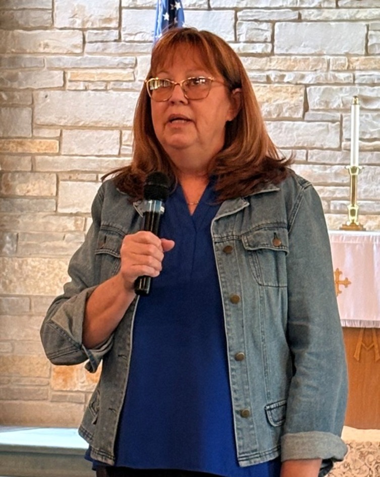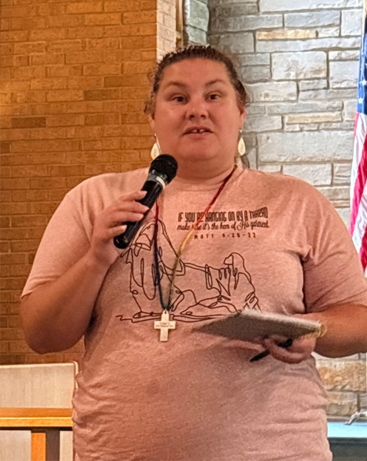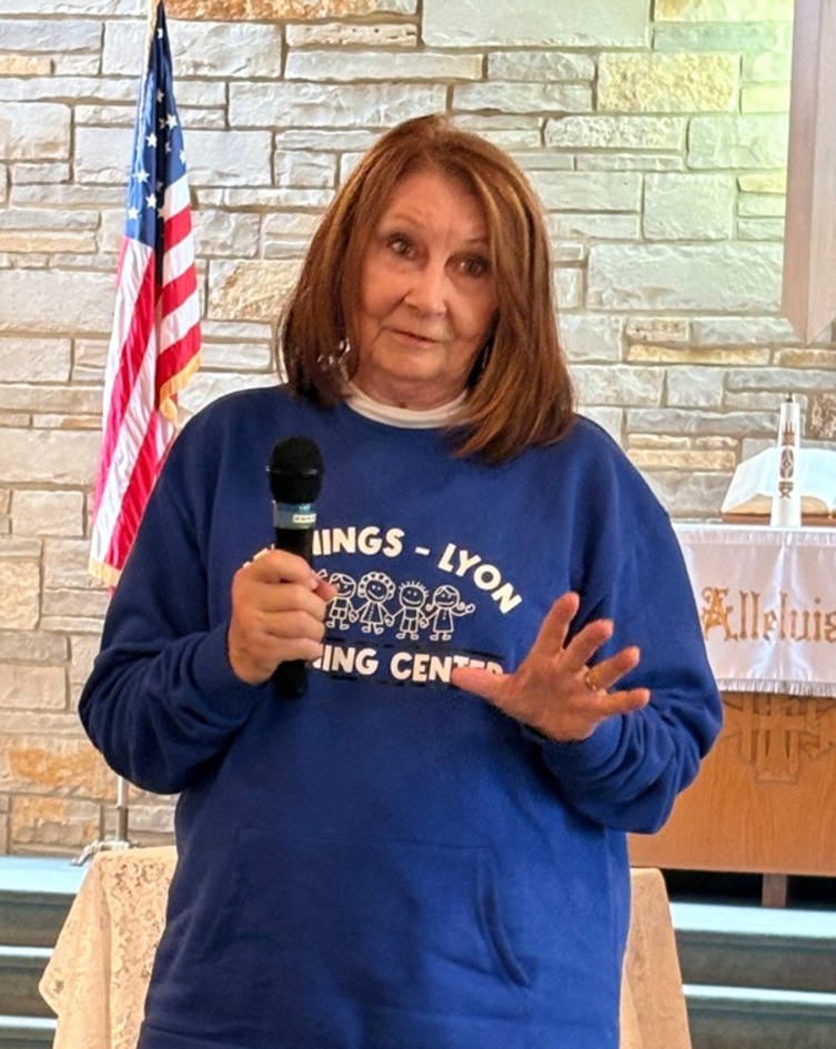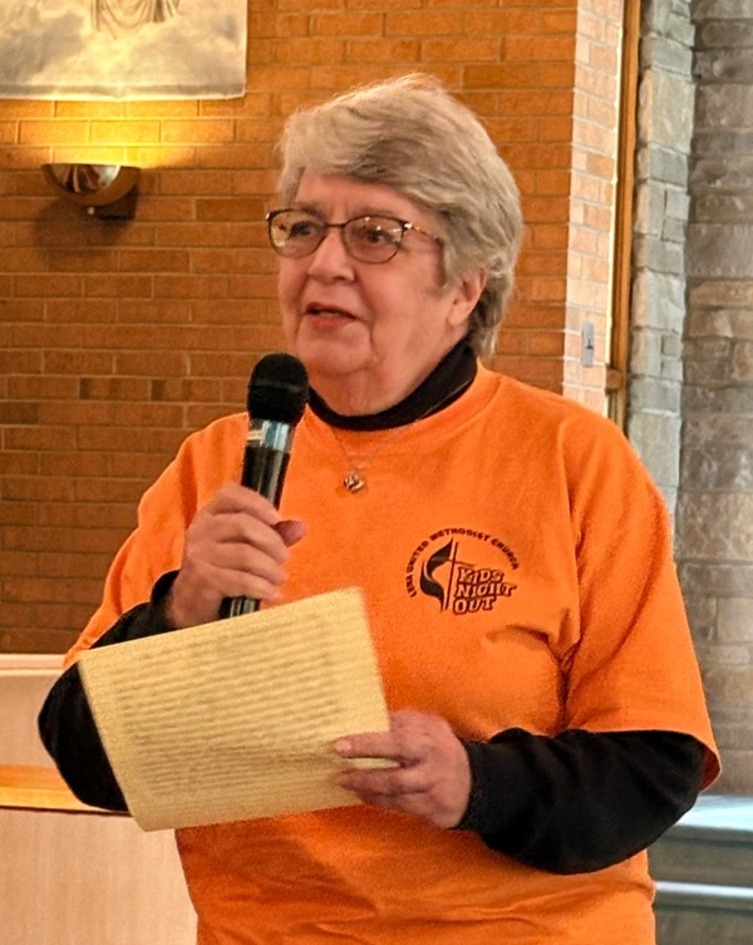 Member from Lena UMC shows off the back of her shirt showing advertisement for their Kids Night Out which is supported by a Keagy Grant.